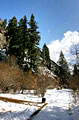 从扎嘎瀑布景区入口处到营区有一条平坦的山道,山路左侧为坡,右侧为深沟,到处长着参天古树。策马前行大约半小时后,经过一条山道,就到了谷底的瀑布景区游览起始点。